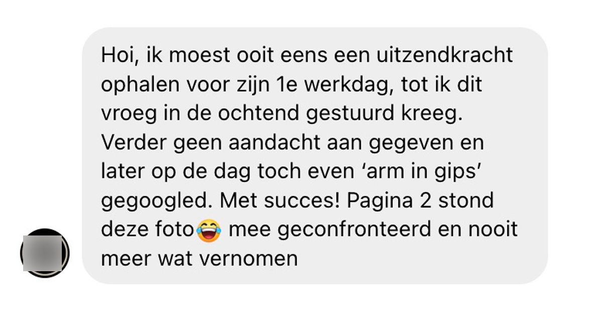 Uitzendkracht meldt zichzelf ziek omdat zijn arm in het gips zit, maar hij had misschien toch beter een andere foto mee kunnen sturen (2 screens)